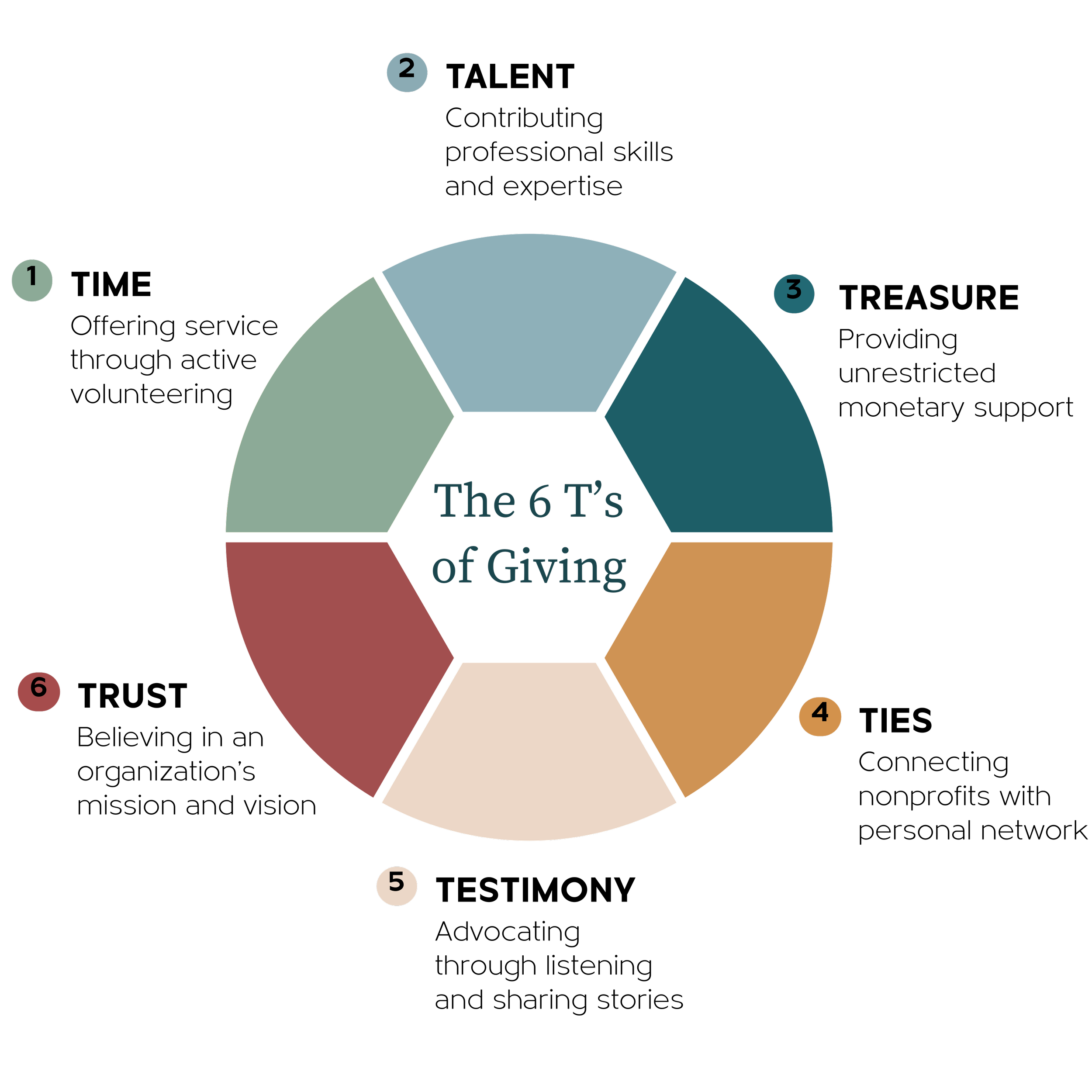 Our partnership is built on the 6 T’s of Charitable Giving, a framework designed to provide nonprofits with support beyond the check.